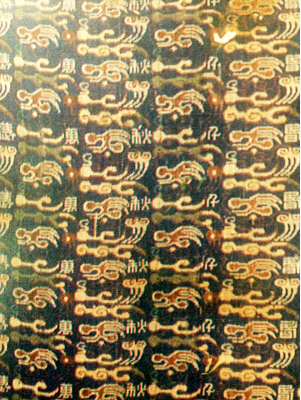 “王侯合昏千秋万岁宜子孙”锦被,隶书汉字穿插于纹样之间,显示着一种吉祥、和谐、安谧的气氛。它的铭文局限了其使用范围,它应是为和亲政策服务的,只能在上层贵族集团之中使用。