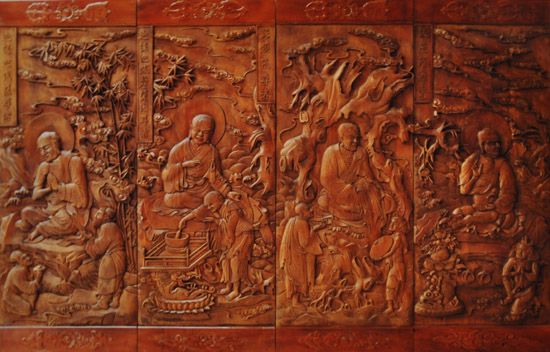 《张胜温画卷》绘于宋代,反映了佛教在南诏、大理国时期的兴盛历史,是研究当时云南大理崇奉密宗的历史和文化艺术的珍贵资料,与同时代的《清明上河图》并誉为“南北双绝”。馆藏古典木雕《张胜温画卷》,1996年由剑川古典木雕厂经3年多时间完成木雕复制,作品高1.82米,长97.6米,造型生动,气势宏大,为云南木雕艺术珍品,也是剑川木雕大型壁画的一次突破。2011年,剑川木雕被国务院列入第三批国家级非物质文化遗产保护名录。