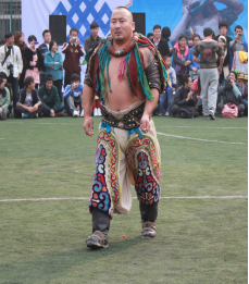 据记载,早在成吉思汗时期搏克运动已经非常流行。搏克是蒙古男儿三项技艺之首,不仅是力量的较量也是技巧的较量。蒙古人称摔跤手为“搏克沁”,参赛时搏克沁身着传统的摔跤服“卓得戈”(紧身半袖坎肩)裸臂盖背。卓得戈多用牛皮制作、边沿镶有铜钉或银钉,后背中间有圆形的银镜,上面有“吉祥”、“好运”等各式各样的祝福文字。腰间系用红、蓝、黄三色绸子做的“策日布格”(围裙)。搏克沁下身穿“班泽勒”(裤)。班泽勒多用白布制成,其尺寸很大,有利于行动和摔跤。在“班泽勒”的外面套一条绣有各种动物或花卉图案的套裤。搏克沁脖颈上配套五色彩绸制成的“将嘎”(项圈),获胜次数越多,“将嘎”上的五色彩绸条也越多。搏克比赛在“搏克音朝乐”声中开始,选手们进场时挥舞着壮实的双臂,跳着模仿狮子、雄鹰等姿态的舞步入场。搏克比赛的规则简单明了,不限时间,参赛者也不分体重,膝盖以上任何部位着地为负。