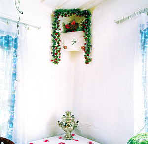 居室内壁镶嵌高1米左右的木板墙围子,铺木质地板、天棚。室内大客厅、小居室,厅内设套间,摆大椭圆高角桌,上面常摆放着鲜花或塑料花,并有造型古朴典雅的电开水壶、茶具,厅外设厨房、卧室。厨房连接客厅的一角搭烤炉,平时烤面包、列巴等面食,冬季可取暖。俄罗斯族人极爱清洁,厨房和烤炉经常粉刷白灰浆,一尘不染。俄罗斯族信奉东正教,居室的东南墙角上方通常会架着装饰的三角板,供奉耶稣和圣母玛利亚像,摆着圣经。