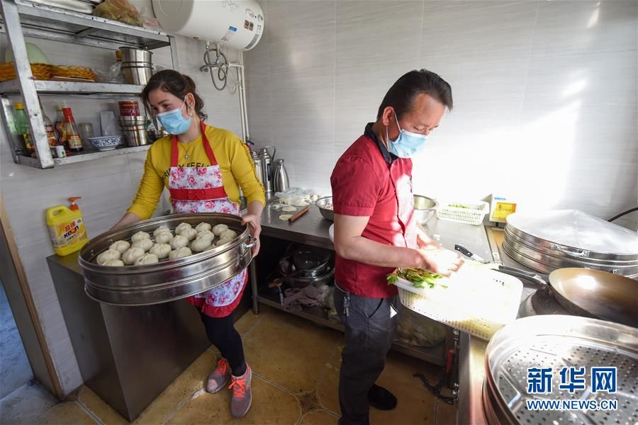 在新疆阿勒泰市,阿布都艾尼·吐尔孙(右)和妻子在早餐店里忙碌。