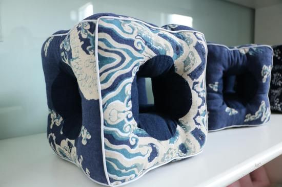 牟春玲拿着一个青花瓷图案的耳枕娓娓道来。耳枕,因枕头中间挖去一块,空间大小恰巧可保护耳朵不受头部压迫而得名。相传,耳枕的历史可以追溯到成吉思汗的年代,士兵夜晚枕戈待旦,中间有孔的枕头可以便于听见敌人和野兽的来袭。后由孝庄出嫁做为陪嫁品被带入清廷并流传开来。蒙古耳枕承载着蒙古民族的智慧和豁达,孝庄枕的寓意是“通即能和”、“和即能通”、“和解天下”、“通达人生”。