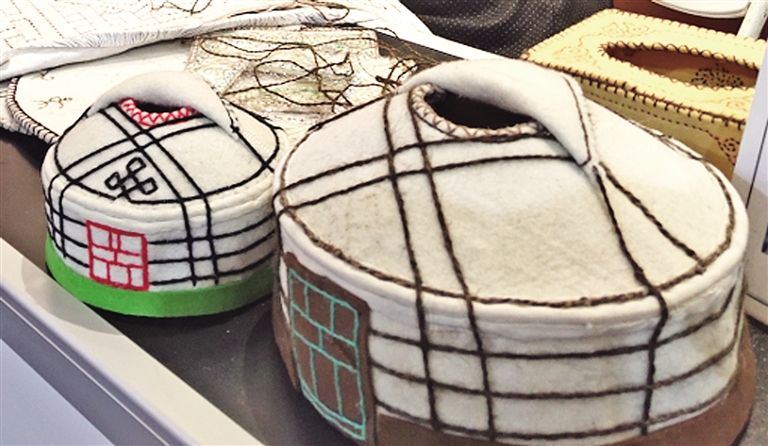 在扩大毡绣市场的同时,苏尼特毡绣从业者们还深耕文化创意,将传统艺术植入到现代设计当中,赋予产品文化和情感符号,让毡绣更符合现代市场发展趋势和消费者的审美需求。他们的创作理念就是将无形的民族文化与精神化为有形的设计,展现在人们的生活中。近年来蒙古族传统毡绣文创产品层出不穷,如儿童毡靴、手账本、背包、冰箱贴、垫子类产品等,并在当地逐渐形成了“阿吉泰”等品牌。