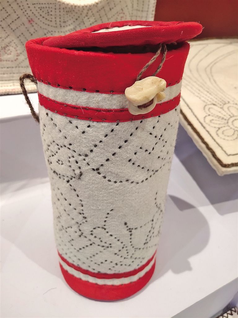 毡绣的制作步骤并不复杂,特别之处就是需要自己纺线。用比较原始的纺锤将特殊材料制成的线纺出,再把细线做成各种规格的绳子,然后就是缝制、压边。
