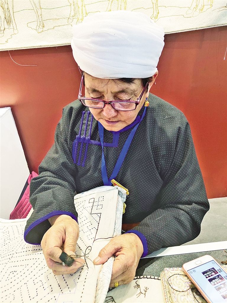 “苏尼特毡绣手工技艺,无论是载体,还是刺绣风格,都具有强烈的游牧民族特色。用制作好的驼绒线配上精细的针法,选取的颜色越多,毡绣作品就越精致。”蒙古族毡绣技艺国家级传承人孟根其其格说。