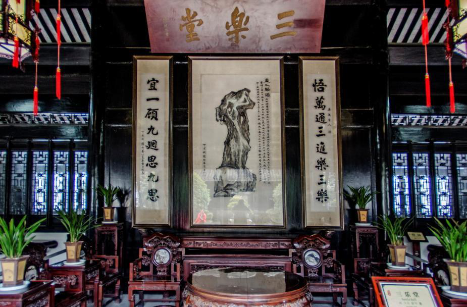 绮园前为宅院,现存三乐堂等建筑。三乐堂为九开间二层楼,前后皆天井,在砖雕门斗上饰飞椽斗拱、隐堂匾额“竹苞松茂”等。所谓的“三乐”,为“仰无愧于天,俯无愧于人,一乐也;父母兄弟俱在,二乐也;聚天下英才而教育之,此三乐也。”陈从周教授为三乐堂题额。宅后为园林,占地10000平方米,水面约2000平方米,树木遮盖约7000平方米。