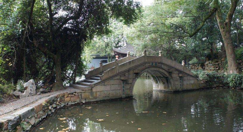 罨画桥是园中唯一的一座拱桥,位于东堤的南端。桥拱甚高,蹬九级蹋步方到桥顶。底下桥洞宽大,非常象江南河网地区便于行船的高拱桥。由于桥身较长,东堤就显得较短,从池西的平沙岸边看去,这一水面的分割就呈半虚半实的状态,再加上作为屏障的大假山,使以此桥为主题的景色充满着浓郁的画意。