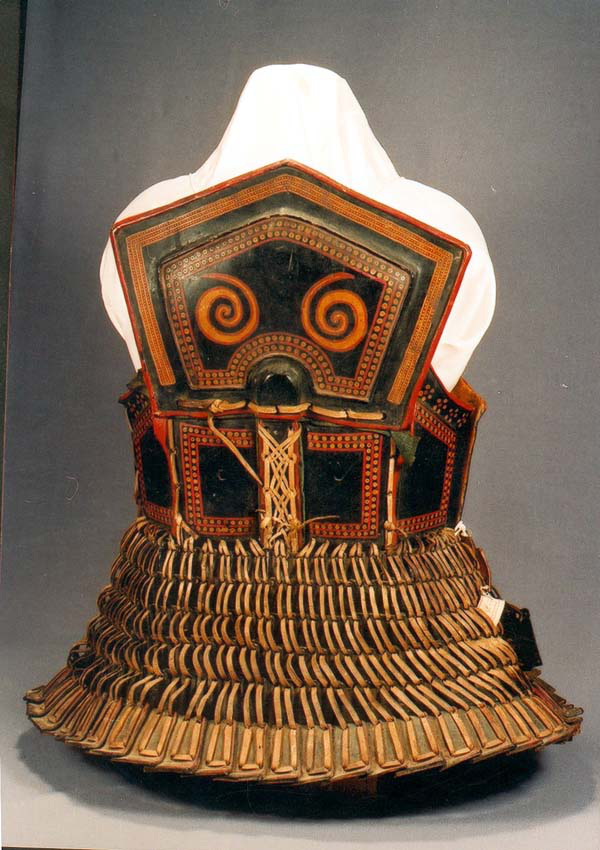 皮铠甲是彝族古老而珍贵的一种护身服饰。据说,最好的皮铠甲是用犀牛皮和象皮制成的,其次是黄牛皮铠甲,现在流传下来的彝族皮铠甲大多是黄牛皮铠甲。皮铠甲做工精细,用生黄牛皮为胎,外表髹漆并饰有彩漆花纹。使用的漆为土生漆,使用时用棕滤过,再加朱砂、石黄、锅烟调和而成。颜色一般有红、黄、黑三色,所绘图案色彩鲜艳,构图对称和谐。皮铠甲在一侧腋下开口,以便穿着。武士穿在身上后,再把开口处用皮绳系结住,使全甲联成一体。因其甲裙较短,并且甲片的尺寸较小,所以主要用于徒步战斗。