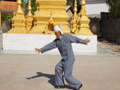 傣族武术早在汉代,傣族武木已见雏形。到了唐朝,唐南诏政权统治管辖了傣族地区,由傣族组成的“白衣没命军”已是南诏最精锐的作战军队。《马可波罗游记》中对当时的傣族是这样描写“男子尽武士,除战争游猎养马外,不作它事”。明代《滇小记》记载:“军民无定居,聚则为军,散则为民,每三人或五人充军一名,正军谓之者刺,犹中国言壮士也。倚象为声势,每战则用绳索自缚于象上,悍而无谋。”据《滇略》卷九说:“威远州今尽为僰人(今傣族)男女勇健,走险如飞,”由此可知:傣族人民不仅能利用本地区的动物,为大家作战,而且逐渐形成了自己独特的武艺,并具备了一定训练手段.在不断的战争中,为适应战争需要,傣族的武艺得到了充分的发展,并促其向军事战斗技能方向发展。在近年的武术挖掘整理工作中,在傣族地区寺庙里发现了部分反映武术的壁画中,有练刀的,也有练剑的。从丰富的壁画内容中,可以看到昔日傣族的武术风貌。傣族武术节奏变化较大,突快突慢,动作柔中有刚,刚中有柔,刚柔相兼,方法简单、实用。练习时,注重基本训练,要求手步灵敏,判断准确,有兔子般的听力,鹰一般的眼力。器械除了棍术、刀术、剑术外,还有链械、勾镰、铁细(铁铣)、铁尺、铁齿、铁锤、象脚鼓对踢对练、链夹对打等。套路约 100 多。对练有:单刀对棍、双刀对棍、四门拳对练、双人对棍、徒手对双刀、链夹对练等。傣族武术的风格,因地区而不尽相同,西双版纳地区是按固定的布局来演练套路:起式后,先从一方练起,然后回到中心,再从另一方练起,又回到中心,依次连续练完各方回到原地便算结束。傣族武术一般都有象脚鼓、铓锣伴奏,表演时,动作节奏感较强。新中国成立后,傣族武术运动员曾多次参加全国少数民族运动会、全国武术观摩表演及对外交往等活动.有的傣族拳师受聘到缅甸教拳,缅甸的傣族、景颇族胞波及华侨也常来云南学习傣族武术,有的傣族拳师还在泰国开办了武术馆。在这些交往中,傣族拳师将其他兄弟民族拳种的优点,吸收融汇于傣拳之中.但仍不失其朴实、随意、短小、精悍的民族风格。