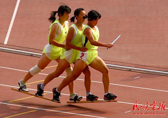 4×100米板鞋竞速接力赛竞争激烈,第十届全国少数民族传统体育运动会上的女子接力赛