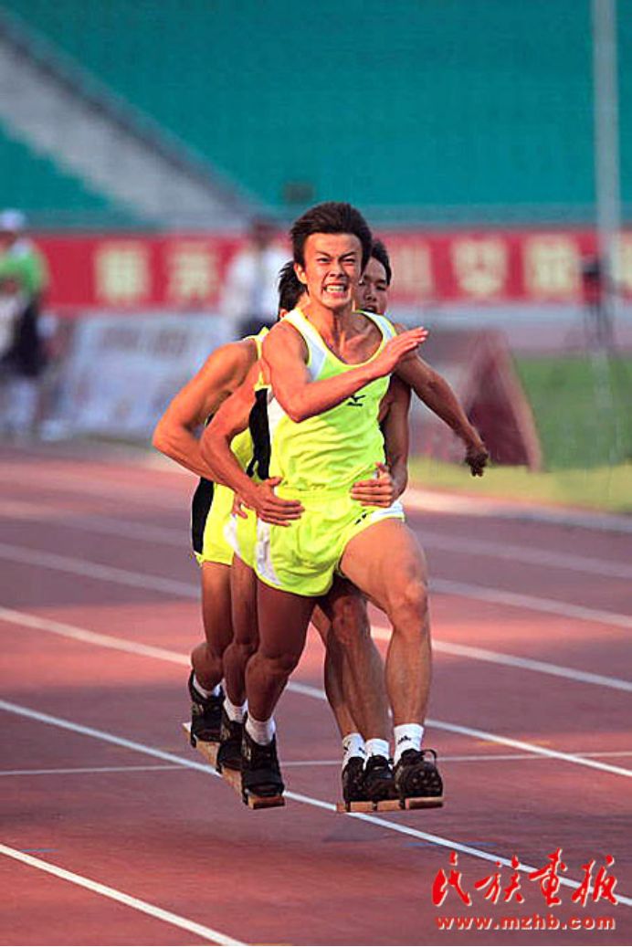 齐心协力 图为第八届全国少数民族传统体育运动会男子100米板鞋竞速
