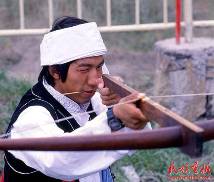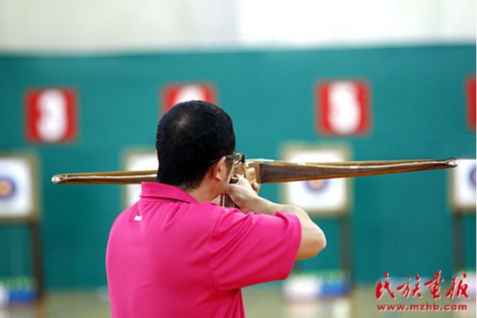 图为第五届全国少数民族传统体育运动会男子跪姿民族传统弩决赛