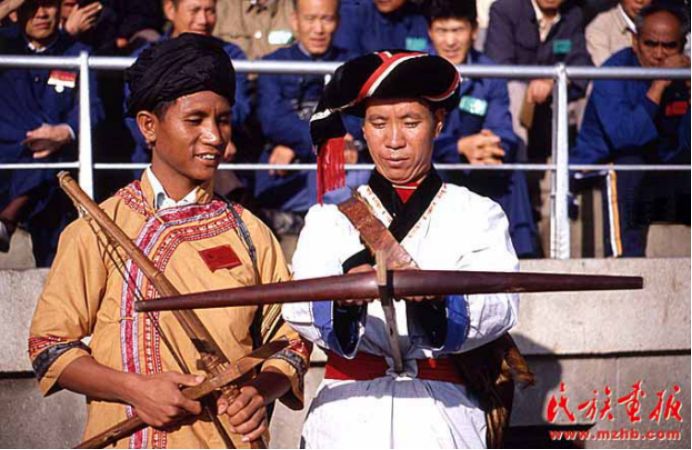 在第二届全国少数民族传统体育运动会上射弩还是表演项目,来自云南和广西的选手在一起切磋技艺。