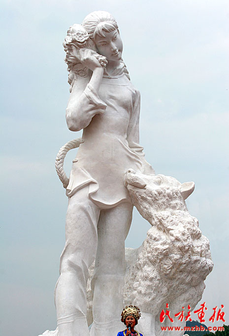 如今,沈从文在《边城》中描述的那个令人疼爱的小姑娘翠翠,已化成一座白色雕像,静静地站在清水江畔,注视着古城变迁。夕阳下的清水江,河面上有数十只木船往来穿梭于清水江上的“翠翠岛”,岛上立着一尊由著名画家黄永玉设计的汉白玉翠翠雕像,翠翠亭亭玉立望着河的下游,后面跟着她的是那只忠实的黄狗。岛的中央是一个能容纳200人左右的民间绝技表演场,这里经常进行苗族民间绝技表演。船家吴胜平对我说:“上岛要登34级台阶,是为了纪念《边城》发表于1934年,中间的两个平台则是代表横跨两个世纪。”整个翠翠岛如一艘巨大的渡船,停泊在清水江上。岛四周由腰鼓形的石柱用钢筋联起,用以维护游人们的安全,每个石柱都是工艺品,花草树木、十二生肖镶嵌其中。岛上70米的橡胶堤是为纪念《边城》发表70周年而建。