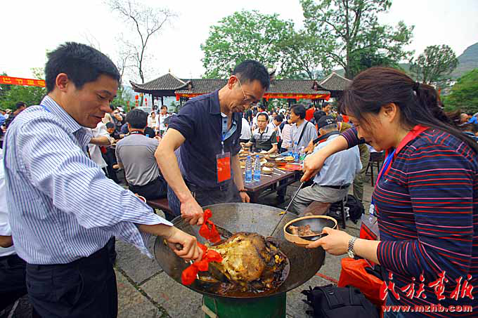 芙蓉镇美食中还有一个富有特色的牛头宴,牛头宴是土家族接待贵宾的盛大礼仪宴会,由专门的传人把刀掌勺。据说,永顺土司彭翼南奉朝谕旨从芙蓉镇码头登船出发,赴闽、江、浙沿海一带抗倭。出征前,土司王大摆牛头宴,5000名土兵士气大振,后在沙场歼敌1900余,《明史》誉为“东南第一战功”。