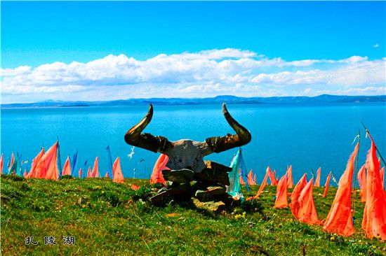 古老的部落战争,为了土地、牛羊和权力,有时候也为了一个女人和一段爱情。相传很久以前的岭国时期,从依日噶部落有三兄弟迁移至玛多境内的扎陵湖(藏语称为加让措)、鄂陵湖(藏语称俄让措)、卓让湖(藏语称为卓让措)旁边定居。因此,以地名为人名,三兄弟分别叫嘉洛、鄂洛和卓洛。大哥嘉洛.敦巴坚赞有一个英俊潇洒的儿子周加,还有一个美丽如仙般的女儿尕洒桑尖周毛,或称“嘉洛.森姜珠牡”,简称“珠牡”。据说格萨尔在12岁那一年的部落赛马大会上取得胜利,并获得王位,同时娶森姜.珠牡为妃。后来,霍尔国的白帐王在黑老鸦教唆下欲强娶森姜珠牡为妻,他乘格萨尔赴北地降魔,岭国守卫空虚之际,在岭国叛将格萨尔的叔叔晁同的帮助下,乘机抢走了森姜.珠牡。身陷霍国的珠牡坚贞不屈,惨遭酷刑,三仙鹤目睹此景,愤然展翅,向岭.格萨尔王传递了不幸的消息,格萨尔在凯旋回朝后战胜了白帐王,迎回了珠牡,接着又战胜了姜国的萨丹王,门域的辛赤王、大食的诺尔王、卡切松耳石的赤丹王、祝古的托桂王等,先后降伏了几十个“宗“(藏族古代的部落和小邦国家)。格萨尔历经百战,降伏各路妖魔之后,功德圆满,与母亲郭姆、王妃森姜.珠牡等一同返回天界。