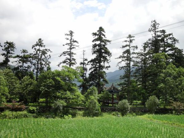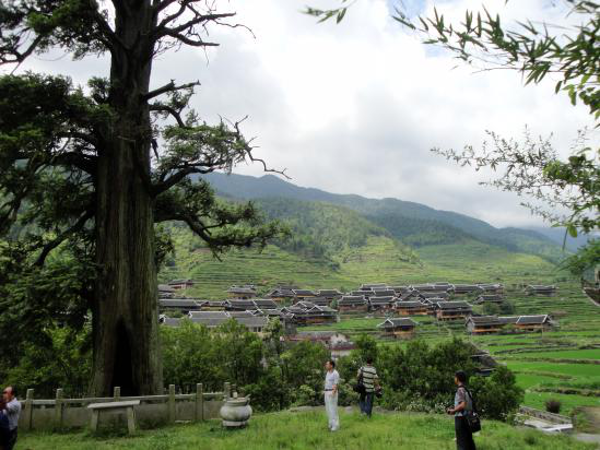 村寨口还有一片苍劲古杉昂首挺立,直入云端,默然无语,只静静守候着这片同样宁静的古寨。这片古杉群共38棵,其中村口前的一棵古杉树,树高28米,胸径2.19米,系东晋时期人工栽培的风水树,树龄达千年,被称为“湖南杉树之王”。侗乡人“万物有灵”的观念很深,人人都崇拜古木,在他们看来,村前的这棵古树象征着村寨的兴旺吉祥,不允许任何人破坏。