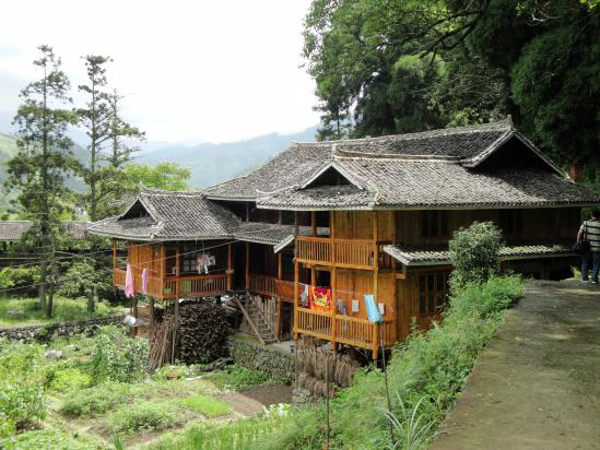 不同于身处熙攘城市时的焦躁,穿行于大寨村时,有种别样的亲切感。大寨依山傍水而建,马路沿着顺流而下的溪水修筑,而寨子则在河的对岸。山青水绿,宁静悠然,除了溪水潺潺,再静一点似乎都能听见远处吊脚楼上冒出的一缕缕炊烟穿过云雾的声音。吊脚楼是侗族人的特色民居,主要由木制成,与城步县其它很多地方常见的吊脚楼构造基本相同,为了隔开山里的湿气,楼房一般为三层:上层储藏粮食、家具,通风干爽;中层住人,怡然自乐;下层储存杂物,用来喂家畜。更为别致的是为了扩大楼房的空间,侗家人会在二、三层的边柱外增加一根悬空的挂柱,用两块梁枋将挂柱承挑着,行人从檐下走过,可免日晒雨淋。有的三五户人家同平地基、共备木料,联合修成连排式民居,既省工省料、整齐划一,又便于各户人家彼此照顾,和睦相处。而外部屋脊上,这里的侗家人也根据自己的独特喜好刷上白色的涂料,从远处看去青瓦白脊,飞檐翘角,顺着山势排列,古朴而有气势。