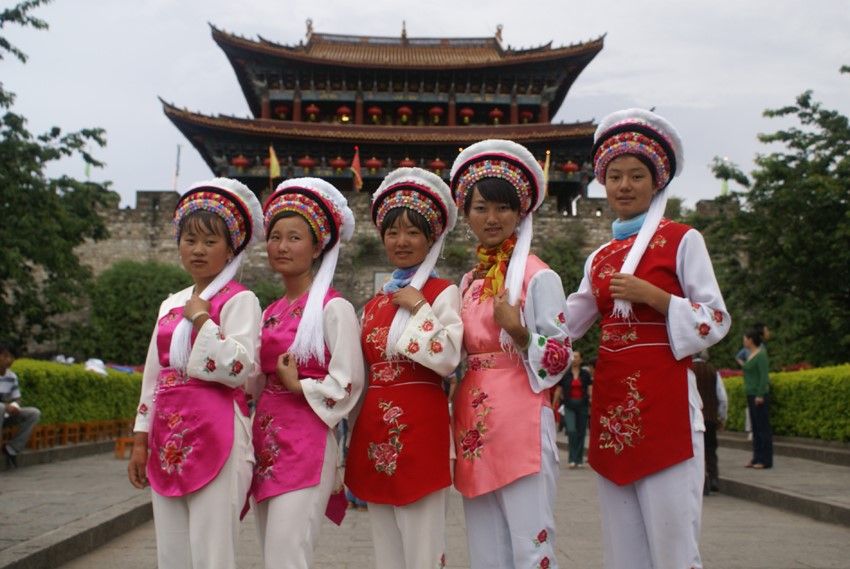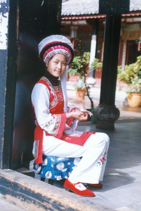 一直以来,享有“金花”美誉的白族妇女的服饰,更是色泽鲜美、绚丽多彩。大理一带的妇女多穿白上衣、红坎肩或是浅蓝色上衣配丝绒黑坎肩,右衽结纽处挂“三须”“五须”的银饰,腰间系有绣花飘带,下着蓝色宽裤,脚穿绣花的“白洁鞋”。手上多半戴纽丝银镯、戒指。已婚妇女梳发髻,未婚少女则垂辫或盘辫于顶,有的则用红头绳缠绕着发辫下的花头巾,露出侧边飘动的雪白缨穗,点染出白族少女头饰和发型所特有的风韵。剑川一带的年轻女子则又喜戴小帽或“鱼尾帽”。洱源西山及保山地区的白族妇女常束发于顶,上插银管,再以黑布包头,穿右襟圆领长衣,系绣花腰带,衣袖和裤脚喜镶绣各色宽窄不同的花边,有的还喜束护腿,显得十分匀称协调和俊俏美观。总之,各地白族的服饰虽呈现出某些地区性的差异,但都色彩明快、映衬协调、挑绣精美、古雅端庄。
