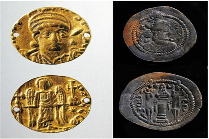 1995年8月固原唐墓出土的东罗马金币(左)与2010年8月文物考古工作者在彭阳县新集乡考古发掘的唐墓群中发现的枚波斯银币(右)