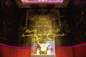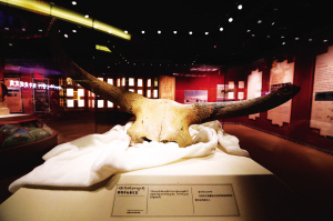 野牦牛头骨化石 这具野牦牛头骨化石出土于甘肃省甘南藏族自治州玛曲县境内的黄河古河床,经碳14鉴定距今有大于4.5万年的历史。 根据最新科学研究,大约距今7300年前,生活在青藏高原的先民将捕获的野牦牛驯化为家牦牛。目前,根据产区生态环境和牦牛自身特征,可将牦牛分为横断高山型和青藏高原草地型两个类型,共8个地方品种或类群。