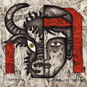 (题图《藏人》是藏族当代画家昂桑的作品。画面中的面孔,一半是牦牛的脸,另一半是藏族青年男子的脸,艺术地体现了藏族与牦牛之间密不可分的联系。)