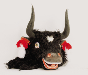 仲孜道具 这件牦牛头是表演“仲孜”时所用的道具。“仲孜”是一种集唱腔、道白、舞蹈于一体的艺术形式。表演“仲孜”时,通常由两人扮演一雄一雌两头“牦牛”,时而蹦跳,时而打滚,时而斗角,时而欢腾。“牦牛”还会用犄角挑起哈达,献给尊贵的客人