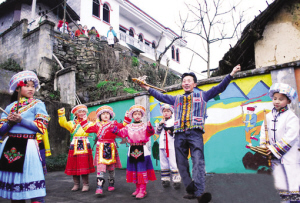 熊永伦(右二)教孩子们由他设计的独具苗乡特色的课间操“挤芦笙”