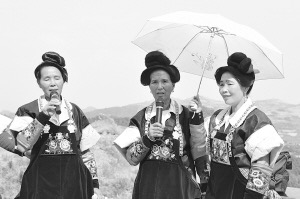 2011年8月25日,来自贵州丹寨周边县市的苗族同胞近2000余人欢聚丹寨县兴仁镇岩英村,以唱山歌比赛的形式欢度一年一度的苗族传统节日爬坡节(左图)。