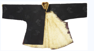 北京服装学院民族服饰博物馆藏黑色窃曲纹提花绸羊皮男袄。
