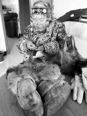 走出博物馆,我来到了熟制兽皮艺术家葛长云的家中。她家墙上挂着她参加各种“非遗”活动的照片,甚至还有她与国家领导人的合影。葛长云今年已经80多岁了,是当地著名的熟皮子能手。她能熟练地使用各种工具,通过晒、压、梳、剪、缝等技艺加工兽皮,使其成为精美的帽、鞋、盒、袋等工艺品和生活用品。此外,她还是一位杰出的鄂伦春族民歌演唱者,能即兴演唱所见所闻。