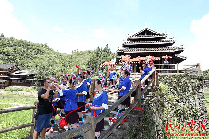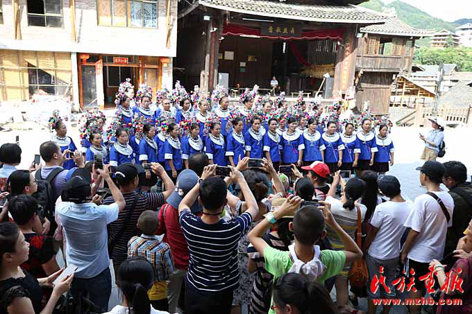 寨子里的侗族大歌演唱队吸引客人争相拍照留念