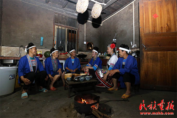 非物质文化遗产侗族煮油茶传承人杨应溪(右三)和外婆寨子里的人学习侗歌