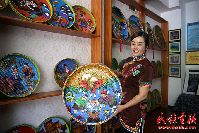 杨应溪向我们介绍实用型旅游纪念品侗族画笸箩