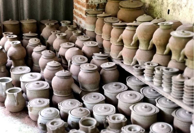 8月10日,在罗城仫佬族自治县四把镇三堆屯的煤砂罐作坊里拍摄到吴昌术制作好的未煅烧的煤砂罐。