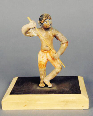 引狮、斗狮的人被称为“狮子郎”,以古代武士装扮,手握旋转绣球,配以京锣、鼓钹,逗引狮子。狮子在“狮子郎”的引导下,表演腾翻、扑跌、跳跃、登高、朝拜等技巧,还有踩滚球等高难度动作。唐朝时期,吐鲁番的狮子郎由胡人或黑人扮演,特别是黑人强健的身体素质,足以承担舞狮这项任务。与泥塑舞狮俑同墓出土的一件彩绘泥塑黑人俑,可能就是一位舞狮者。该俑由细泥捏塑再施彩绘而成,圆头圆脸,头发短而卷曲,大耳,皮肤黝黑,厚唇紧闭,大眼有神,皂白分明;上身裸露,下穿一条桔红色的短裤;手执木棍作舞蹈动作。从人物造型到服饰造型,该俑都是典型的非洲黑人形象,并具有浓郁的写实风格。