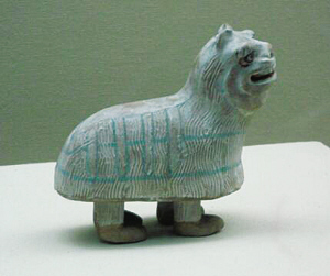 唐代吐鲁番的曲艺和舞蹈艺术别具特色,有踏谣娘、大面、狮子舞、马舞等多种形式。1960年出土于阿斯塔那墓的唐代彩绘泥塑舞狮俑,现藏于新疆维吾尔自治区博物馆。该俑高12厘米、长10厘米,由狮身与狮足两部分构成,其足明显是人形。狮身是用掺有毛绒的细泥塑成的,狮子躯体外表及腿周均用篦状物压划出弯曲的条纹,象征通体披皮,即所谓“缀毛为衣”。狮身中脊饰彩带1条,两侧有下垂的彩带各4条,互相对称,且与中脊彩带相垂直。这件舞狮俑的造型应是模仿民间演出的舞狮形象。