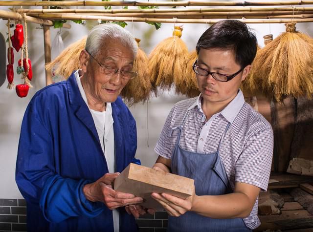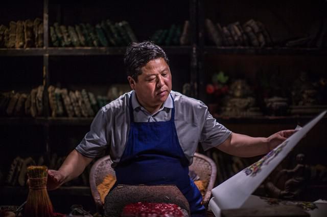 向年轻艺人李力传授年画技艺