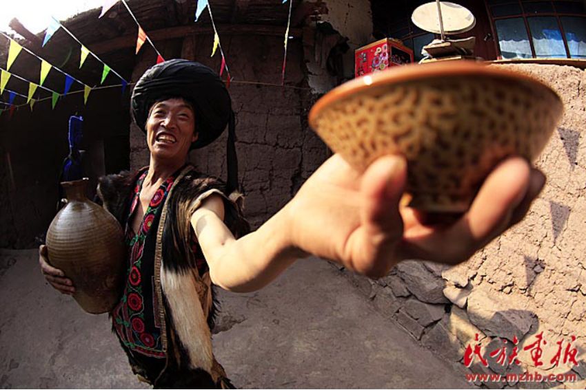主人家抬出几大坛米酒,拿出几十根空心麻杆插入坛内,供吸吮米酒