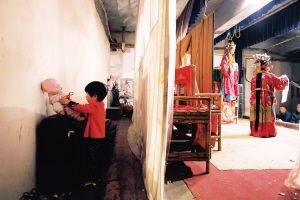 爷爷奶奶在前台表演,戏班的孩子独自在幕布后和布娃娃玩耍。
