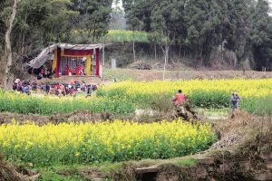 我曾经跟随永丰川剧团下乡演出。刚走到庙山的垭口,老远就听见咿咿呀呀的高腔声回荡在空寂的山野。遍地是金黄的油菜花,蓝天白云下,搭建在土坡菜地中的简陋戏台显得有些寂寥突兀。戏台上,演员们正演得起劲,胡琴、锣鼓喧嚣热闹,三五十位老人和小孩散坐在土坝里,看得津津有味。