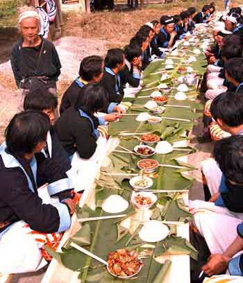 长席宴 白裤瑶人每逢最盛大的活动和重大节庆,一般都是以长席宴的方式来招待客人。拿出自己的拿手好菜,摆成数百米的长席。白裤瑶因信仰习俗(也许亦因贫穷),荤菜基本只吃猪肉、鸡肉野味和普普通通的农家菜,并非专业厨师掌厨的菜。然而,那些饭菜,却非常的香。真正的土鸡、土猪,真正绿色环保的蔬菜瓜果,加上烹调大妈大叔的用心,平常的菜肴即绽放出它们的美味。真正的美味,不在于大鱼大肉的华丽,不在于诸多配料机巧,而在于质朴的原生态蔬菜鲜肉。真正的美味,不在文人雅舍,不在宾馆餐厅,而像油茶花那样,在民间自然地蓬勃。瑶家老庚把你当朋友,才会热情的招待你,一起饮玉米酒,吃豆腐菜,喝火麻粥,吃瑶家鸡和黑猪,吃地头种的蔬菜瓜果。围坐在博物馆门前的长廊里吃饭,那种感觉真像是在家里过节。正所谓,味蕾绽放里,不知身是客。在这样的风景里,身心都是惬意的。
