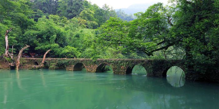 小七孔古桥建于清道光十五年(公元1835年),古为黔南通往广西商旅交通要道,横跨响水河。桥下潭水幽蓝,两岸古木萌绿,衬出桥的雅静恬美。桥长40米,宽2.2米,高5.5米,桥体取拱形,结构玲珑,工艺精妙。