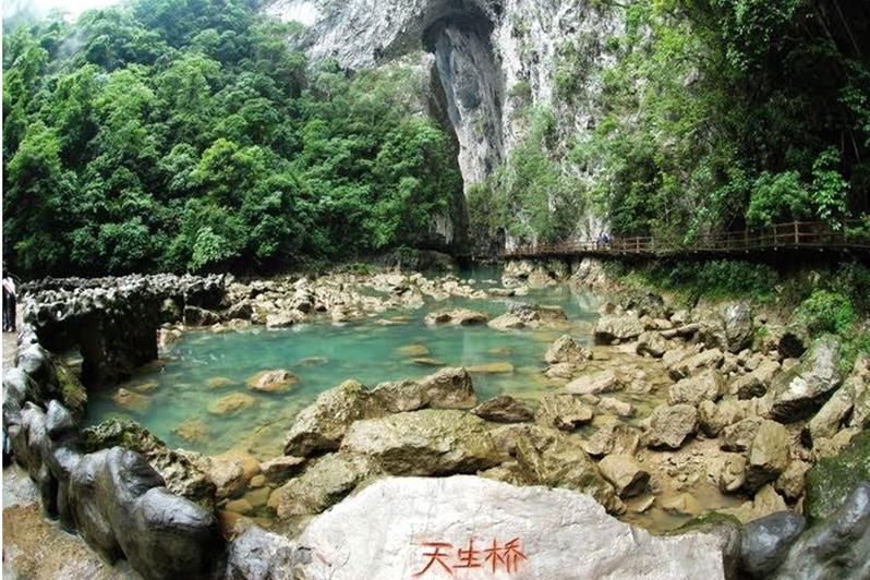 天生桥高约73米,厚约15米,宽约22米,这座大自然鬼斧神工凿造而成的天生桥被人们誉为“东方凯旋门”,观之令人肃然起敬,不禁为大自然巧夺天工之神力所折服。天生桥发育石炭系(距今360~290百万年)的灰岩和泥灰岩中。岩屋走向为东北—西南方向,岩层倾角为56°。桥下河道为第四纪晚期(距今约1.2万年)地下暗河通道,后来地壳抬升、地下河下切,地下暗河洞体规模扩大、洞顶崩塌。