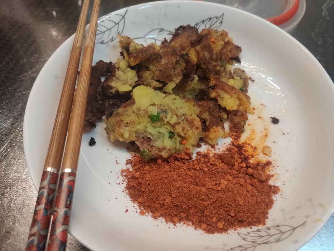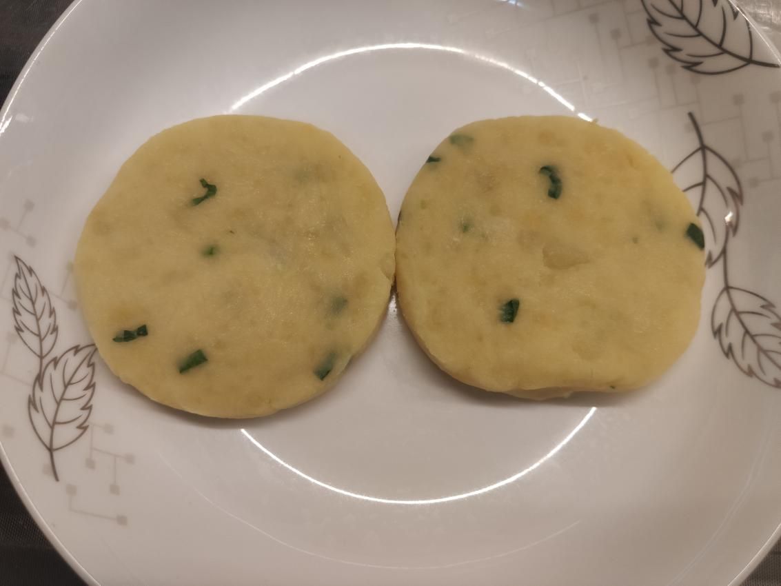 土豆植物油葱花烧烤用调味辣椒首先选取品质上好的土豆,(贵州西部威宁地区产出的土豆最佳)洗净后去皮,放入蒸锅中蒸至土豆彻底软化,可以用手彻底捏成糊状即可。把蒸好的土豆取出,全部捏成糊状,(不加水)期间可以在手上涂抹植物油,这样可以在捏碎土豆的过程中让糊状的土豆不宜沾在手上。土豆全部捏成糊状后,加入葱花,再次搅拌,待搅拌均匀后,把糊状的土豆捏成饼一样的形状,方便二次加工。
