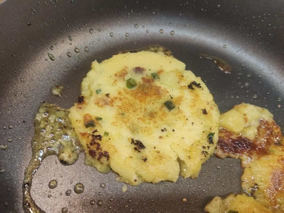 油温热后,放入洋芋粑,并用锅铲对其表面进行挤压,确保洋芋粑底部受热均匀,并在底部煎至金黄后翻面,继续加热。