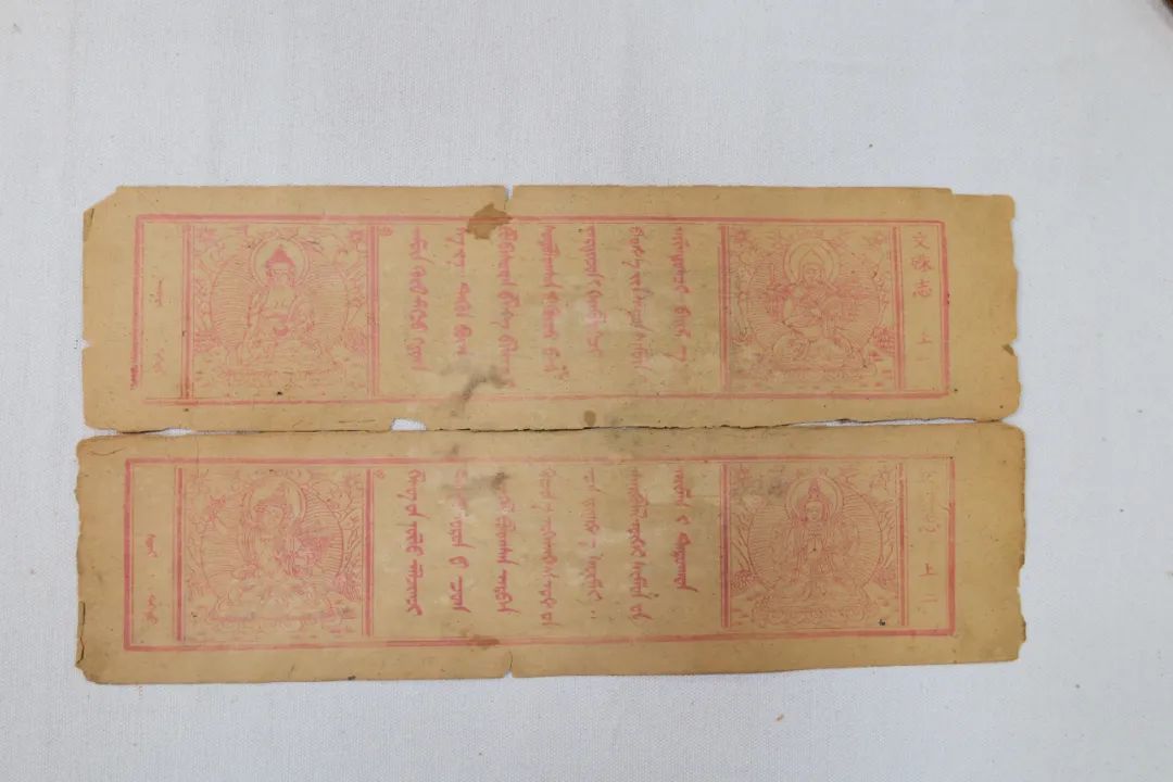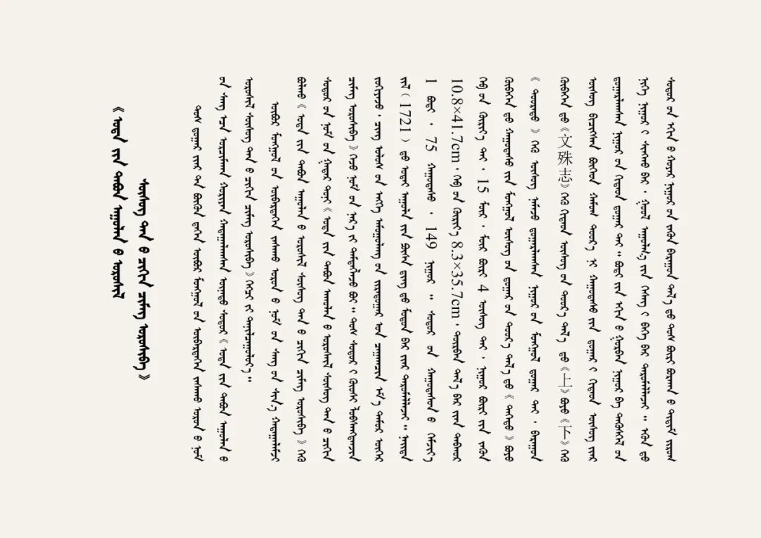 《五台山志》,蒙语为“uda-yin tabun aγulan-u orošil süsüg-ten-ü čikin čimeg orošiba”,由清高僧、国师罗卜桑丹津编写,于清康熙六十年白铁牛年(1721)五台山菩萨顶刊刻。木刻本,共1卷,75叶,149页,每页15行,每行4字,字体为木刻版字体。梵夹装,页面高10.8cm、宽41.7cm,版框高8.3cm、宽35.7cm,四周双围格。每页左侧有蒙古文页码、右侧有汉字“文殊志”和汉文页码。本经卷的卷首三页和卷末一页为朱印,其余部分是墨印本。其中卷首两页的左右两侧和卷末整页绘有佛像。