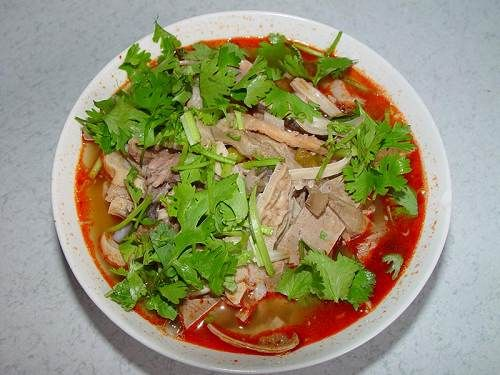 正宗的羊杂汤,讲究前一天下午熬好汤,所有羊杂在底汤中浸泡一夜,第二天再次加热。食用时,取汤锅中熟羊肉和羊杂切碎放入碗中,再盛上羊汤,加上蒜苗末、香辣油,配着芝麻烧饼一起吃。