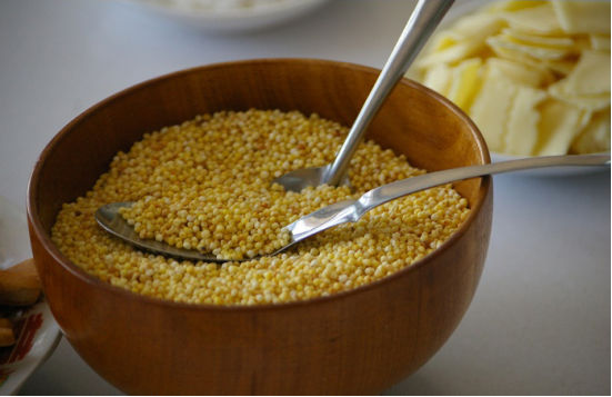 炒米的原料是糜米,要经过煮、炒、碾等工序制成。先将洗净、去掉杂质的糜米放入锅中煮沸,待破开米嘴后,马上出锅晾干再炒熟,炒锅中要加入干净的细沙和糜米混在一起。这样炒出的炒米发硬,有嚼头,是蒙古人喜欢的口感。但没有破嘴就炒出的炒米,发软好咬,但没有什么嚼头,被当地人称作“汉人炒米”。最后,将炒好的糜米用石碾碾去皮,既可食用。
