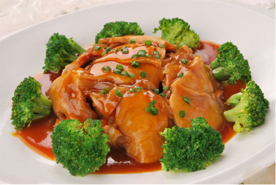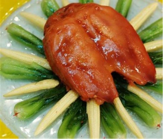 菜品:用驼掌和鸡、鸭蒸、烧而成。成菜色泽深红,驼掌软烂筋糯,鲜味浓厚。